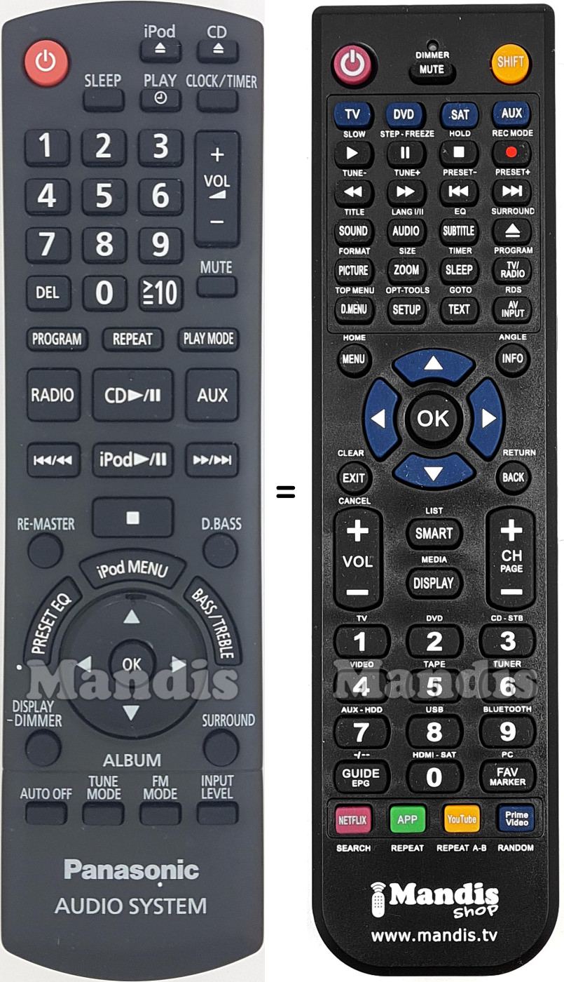 Below, we will show you the correspondence between each button on the original remote control and the button that performs the same function on the replacement remote control. In some cases, you may need to press the SHIFT key before pressing another button to perform certain actions. These additional functions are often not widely used and are included to facilitate understanding of the replacement remote control, or because the original remote control has more buttons than its equivalent.
