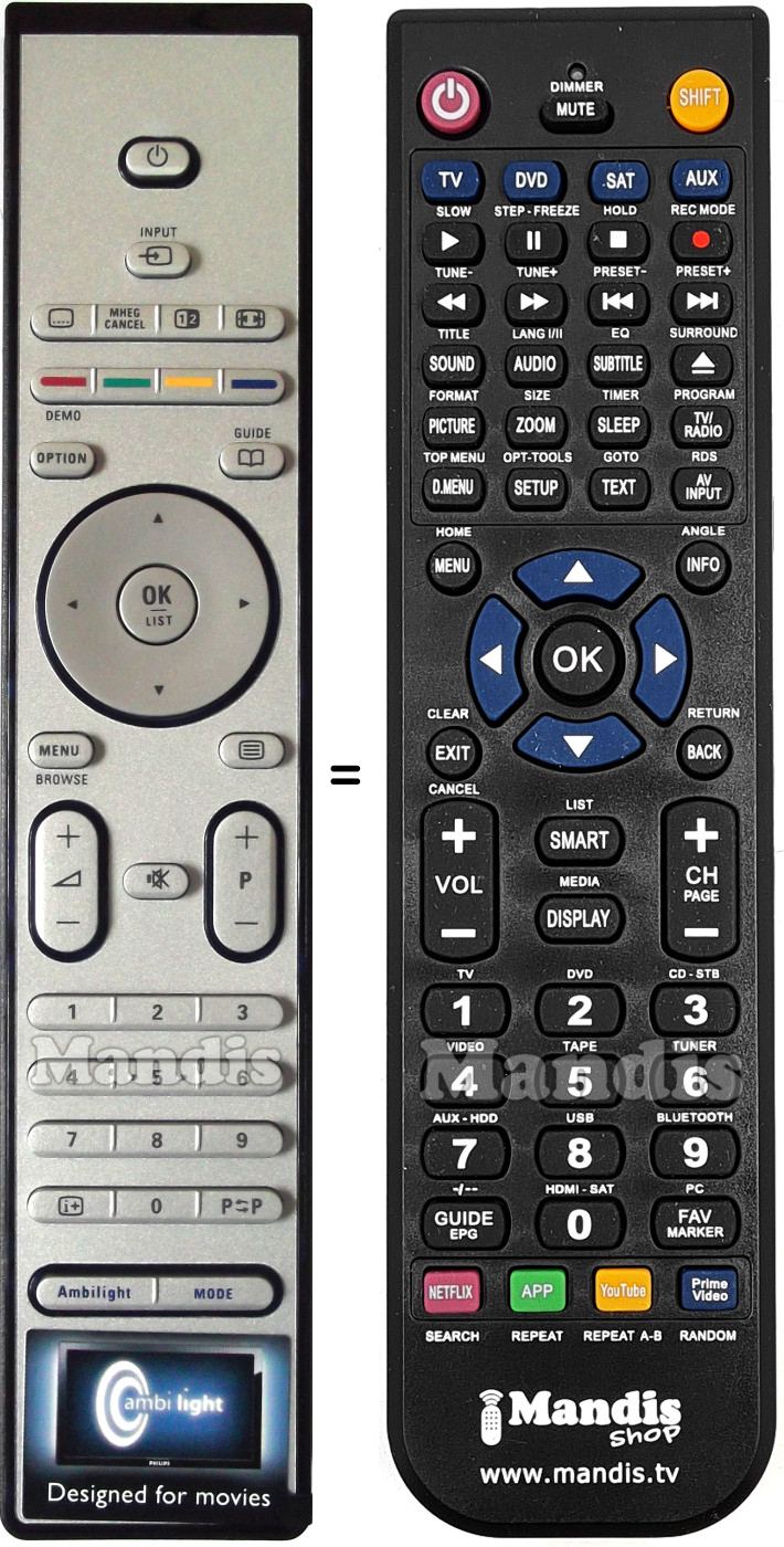 This remote control performs all the functions of the original remote control: POWER, INPUT, [...], MHEG/Cancel, [1I2], [<>], RED/DEMO, GREEN, YELLOW, BLUE, OPTION, GUIDE, MENU/BROWSE, [=], OK/LIST, UP, DOWN, RIGHT, LEFT, VOL+, VOL-, P+, P-, MUTE, 1, 2, 3, 4, 5, 6, 7, 8, 9, 0, [i+], P↔P, AMBILIGHT, MODE
