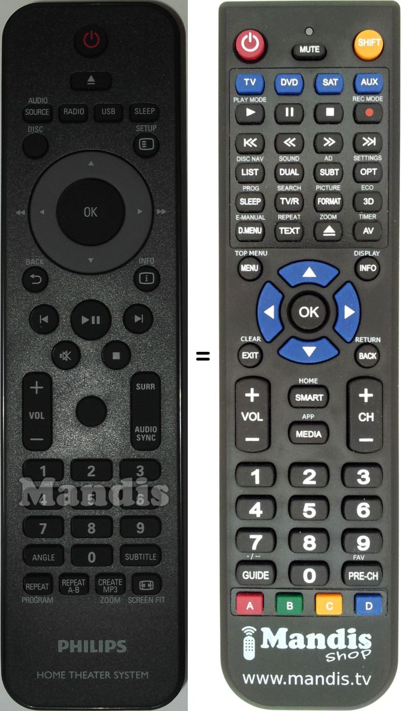 Below, we will show you the correspondence between each button on the original remote control and the button that performs the same function on the replacement remote control. In some cases, you may need to press the SHIFT key before pressing another button to perform certain actions. These additional functions are often not widely used and are included to facilitate understanding of the replacement remote control, or because the original remote control has more buttons than its equivalent.