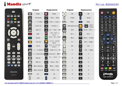 This remote control performs all the functions of the original remote control: Power, Teletext, Dual I / II, , AV, Red, Geen, Yellow, Blue, Subtitle, Dual Window, Cancel, Option, Menu Analog, Menu Digital, Up, Right, Down, Left, OK, Analog / Digital, EPG, Vol +, Vol -, Mute, P +, P -, 1, 2, 3, 4, 5, 6, 7, 8, 9, 0, Info, P<P / Back, Ambilight ON/OFF, Ambilight Mode, Sound, Picture