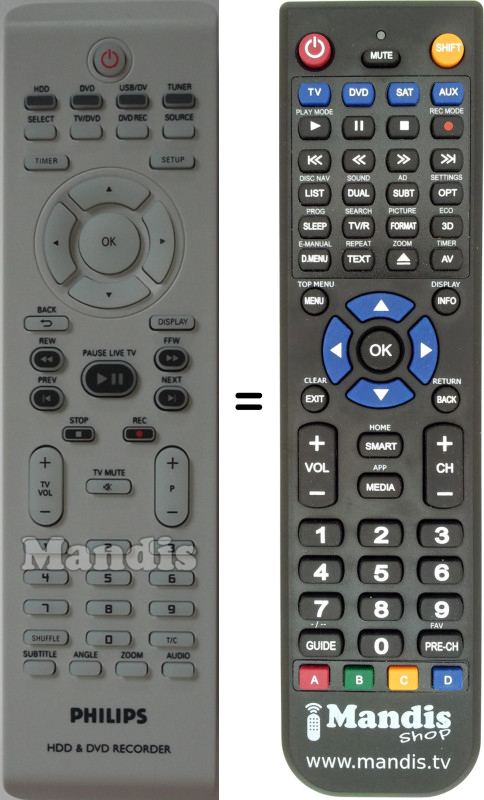 Below, we will show you the correspondence between each button on the original remote control and the button that performs the same function on the replacement remote control. In some cases, you may need to press the SHIFT key before pressing another button to perform certain actions. These additional functions are often not widely used and are included to facilitate understanding of the replacement remote control, or because the original remote control has more buttons than its equivalent.