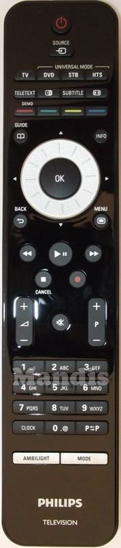 Power, Source, TV, DVD, STB, HTS, Teletext, [1|2], Subtitle, Format, Red / Demo, Green, Yellow, Blue, Guide, Info, Up, Right, Down, Left, OK, Back, Menu, <<, Play / Pause, >>, Stop / Cancel, Rec, Vol +, Vol -, Mute, P +, P -, 1, 2, 3, 4, 5, 6, 7, 8, 9, 0, Clock, P↔P, Ambilight, Mode