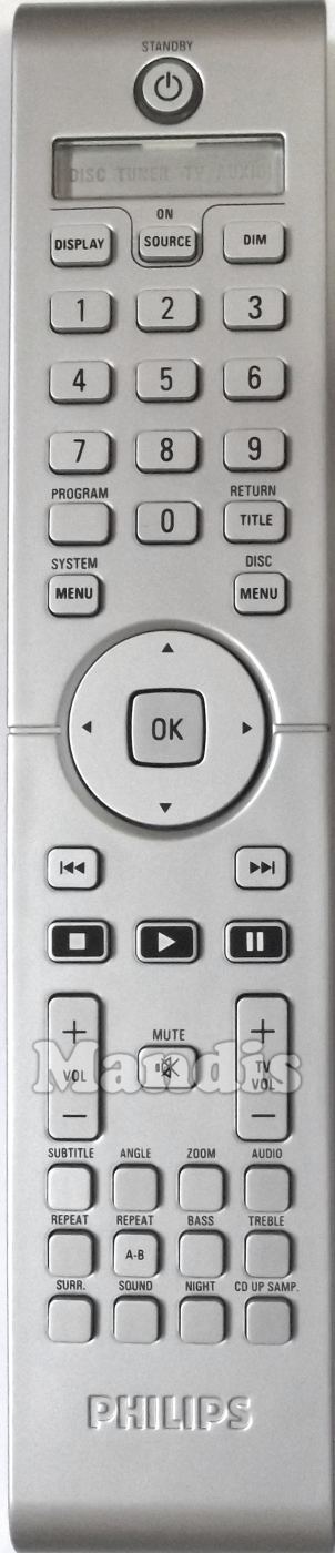 Standby, Source On, Display, DIM, 1, 2, 3, 4, 5, 6, 7, 8, 9, 0, Program, Title / Return, System Menu, Disc Menu, Up, Left, OK, Right, Down, I<<, >>I, Stop, Play, Pause, Vol +, Vol -, Mute, TV Vol +, TV Vol -, Subtitle, Angle, Zoom, Audio, Repeat, Repeat A-B, Bass, Treble, SURR., Sound, Night, CD UP Samp.