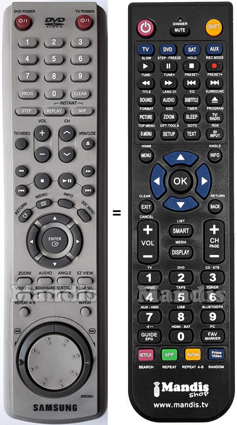 Below, we will show you the correspondence between each button on the original remote control and the button that performs the same function on the replacement remote control. In some cases, you may need to press the SHIFT key before pressing another button to perform certain actions. These additional functions are often not widely used and are included to facilitate understanding of the replacement remote control, or because the original remote control has more buttons than its equivalent.