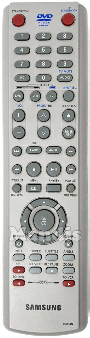 Standby / On, TV Standby / On, 1, 2, 3, 4, 5, 6, 7, 8, 9, 0, IPC, Autio / TV Mute, DVD, VCR, TV, Input Sel, Vol+, Vol-, Prog/TRK+, Prog/TRK-, Open / Close, Timer Rec, I<<, F.Adv Skip, Marker, >>I, <<, Stop, Play / Pause, >>, Title List / Disc Menu, Menu, Anykey, Play List / Title Menu, Up, Left, OK, Right, Down, Return, Clear, Info, TV/VCR, Subtitle, Angle, Rec, Rec Speed, Rec Pause, Zoom, Copy to DVD, Copy To VCR