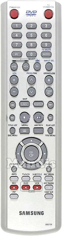 Standby / On, TV Standby / On, 1, 2, 3, 4, 5, 6, 7, 8, 9, 0, IPC, Audio / TV Mute, Select DVD, Select VCR, Select TV, Input Sel, Vol +, Vol -, Prog/TRK +, Prog/TRK -, Open / Close, Timer Rec, I<<, F.Adv / Skip, Marker, >>I, <<, Stop, Play / Pause, >>, Title List / Disc Menu, Menu, Anykey, Play List / Title Menu, Up, Left, OK, Right, Down, Return, Clear, Info, TV / VCR, Subtitle, Rec Speed, Rec, Copy DVD, Copy VCR, Rec Pause, PIP, Time Slip