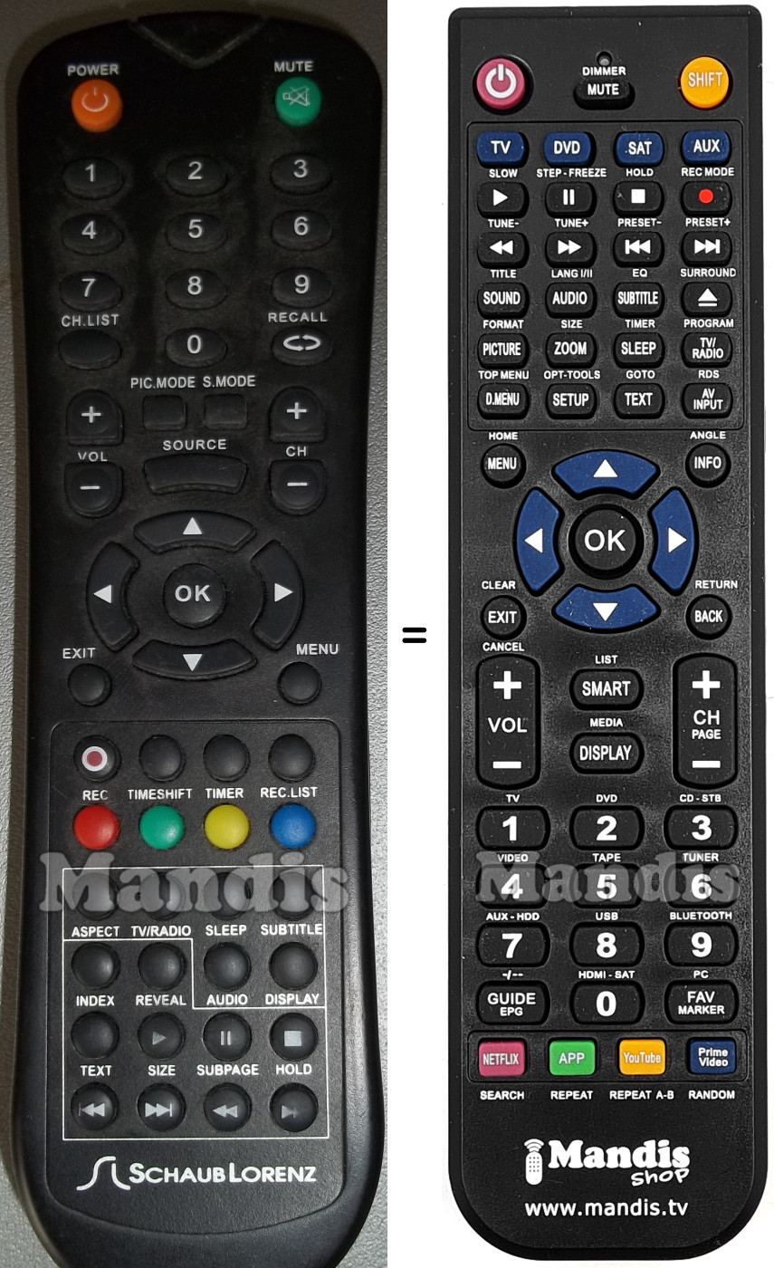 Below, we will show you the correspondence between each button on the original remote control and the button that performs the same function on the replacement remote control. In some cases, you may need to press the SHIFT key before pressing another button to perform certain actions. These additional functions are often not widely used and are included to facilitate understanding of the replacement remote control, or because the original remote control has more buttons than its equivalent.