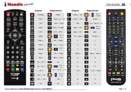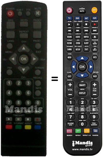 Below, we will show you the correspondence between each button on the original remote control and the button that performs the same function on the replacement remote control. In some cases, you may need to press the SHIFT key before pressing another button to perform certain actions. These additional functions are often not widely used and are included to facilitate understanding of the replacement remote control, or because the original remote control has more buttons than its equivalent.