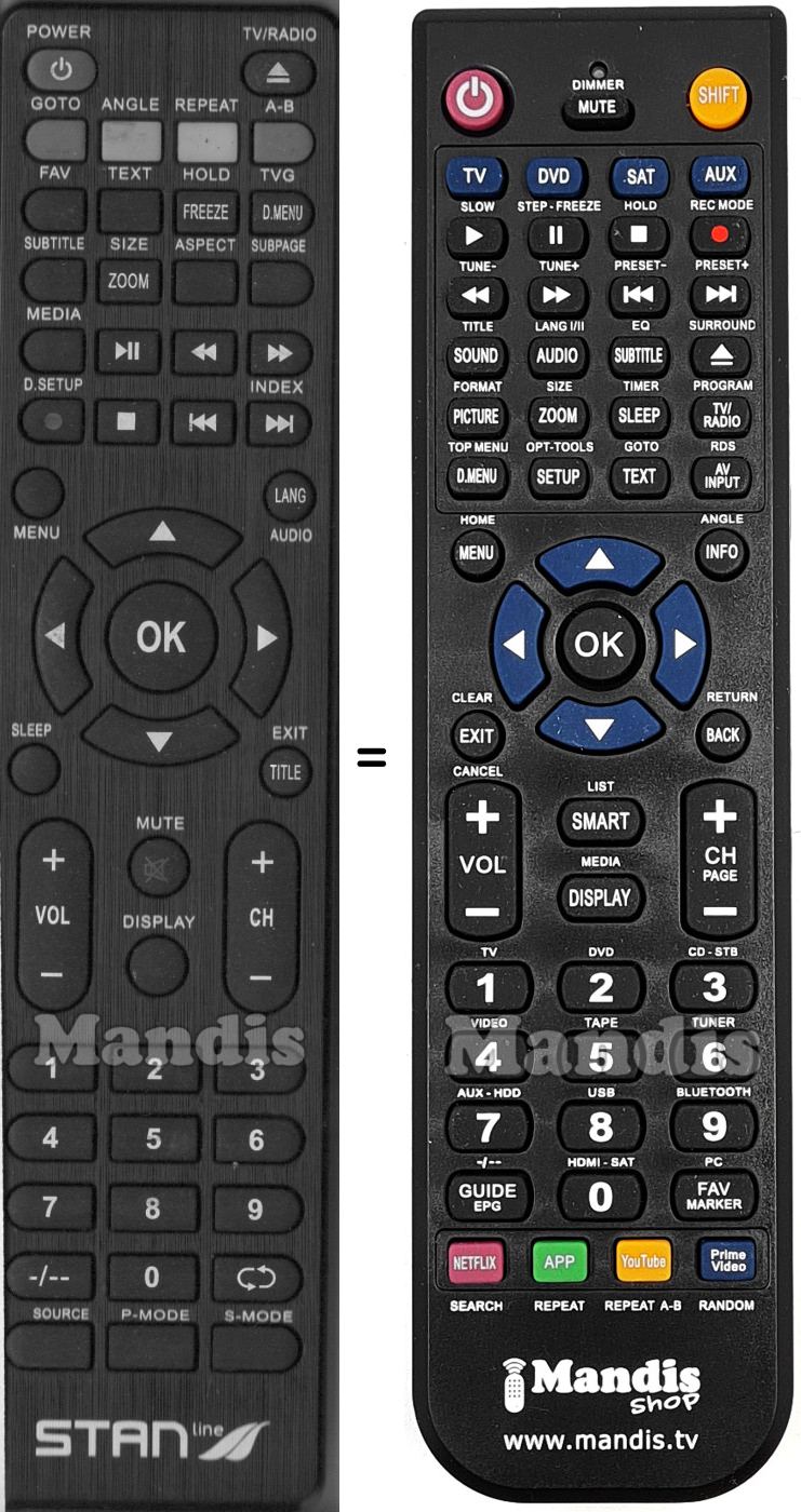 Below, we will show you the correspondence between each button on the original remote control and the button that performs the same function on the replacement remote control. In some cases, you may need to press the SHIFT key before pressing another button to perform certain actions. These additional functions are often not widely used and are included to facilitate understanding of the replacement remote control, or because the original remote control has more buttons than its equivalent.