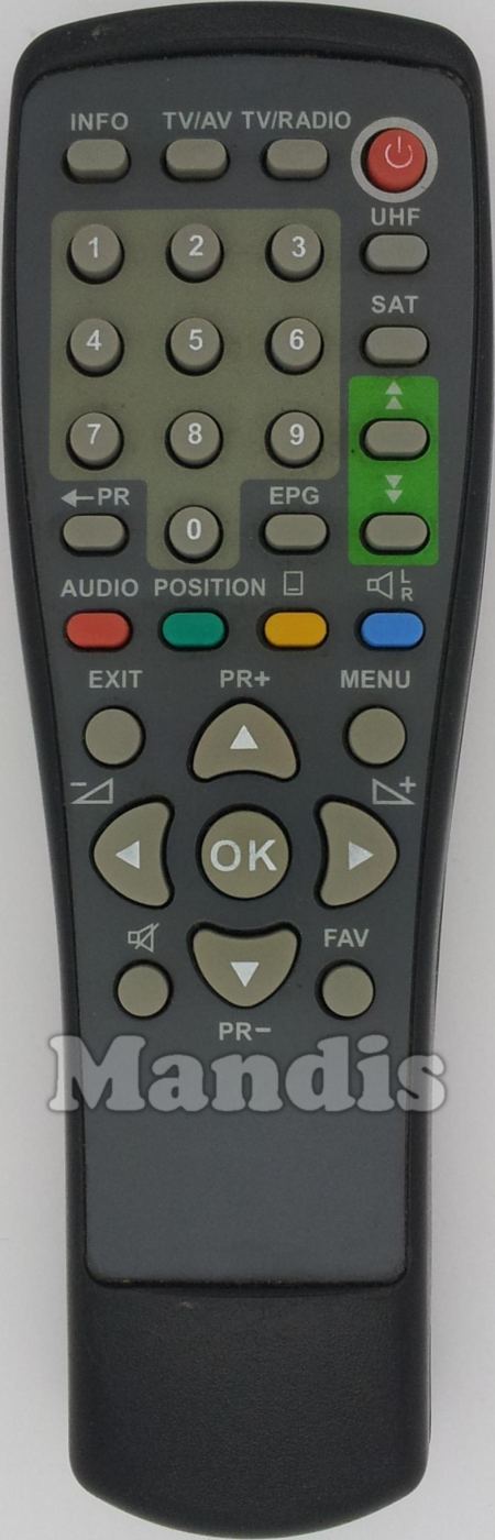 POWER, INFO, TV/AV, TV/RADIO, 1, 2, 3, 4, 5, 6, 7, 8, 9, 0, RCL, EPG, RF, SCAN, ↑, ↓, RED/AUDIO, GREEN, YELLOW/[...], BLUE/AUDIO L/R, EXIT, MENU, UP/PR+, DOWN/PR-, RIGHT/VOL+, LEFT/VOL-, MUTE, FAV, OK