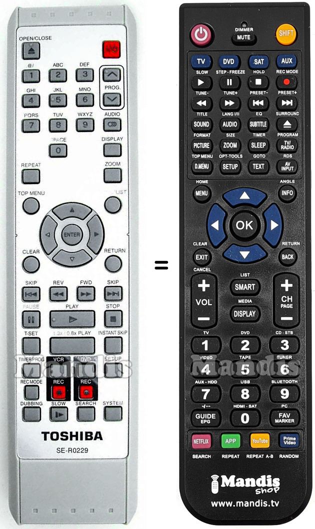 Below, we will show you the correspondence between each button on the original remote control and the button that performs the same function on the replacement remote control. In some cases, you may need to press the SHIFT key before pressing another button to perform certain actions. These additional functions are often not widely used and are included to facilitate understanding of the replacement remote control, or because the original remote control has more buttons than its equivalent.