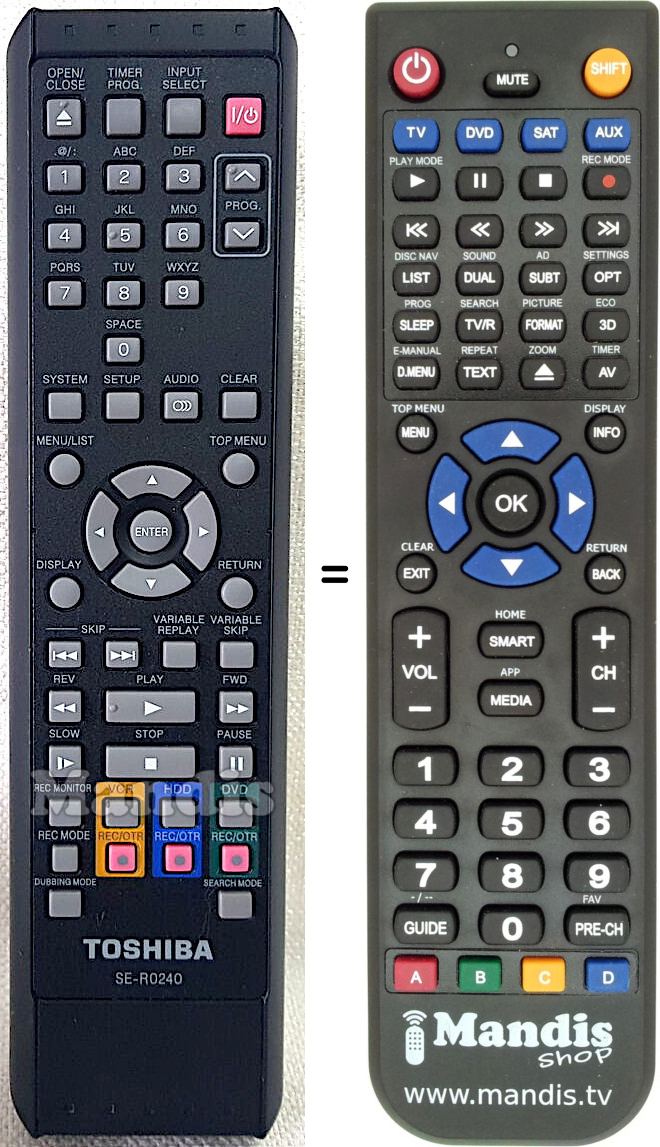Below, we will show you the correspondence between each button on the original remote control and the button that performs the same function on the replacement remote control. In some cases, you may need to press the SHIFT key before pressing another button to perform certain actions. These additional functions are often not widely used and are included to facilitate understanding of the replacement remote control, or because the original remote control has more buttons than its equivalent.