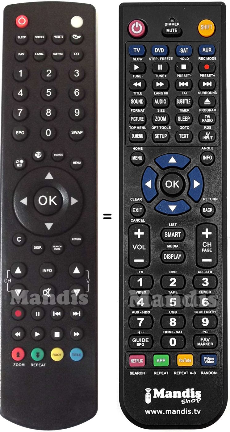 Below, we will show you the correspondence between each button on the original remote control and the button that performs the same function on the replacement remote control. In some cases, you may need to press the SHIFT key before pressing another button to perform certain actions. These additional functions are often not widely used and are included to facilitate understanding of the replacement remote control, or because the original remote control has more buttons than its equivalent.